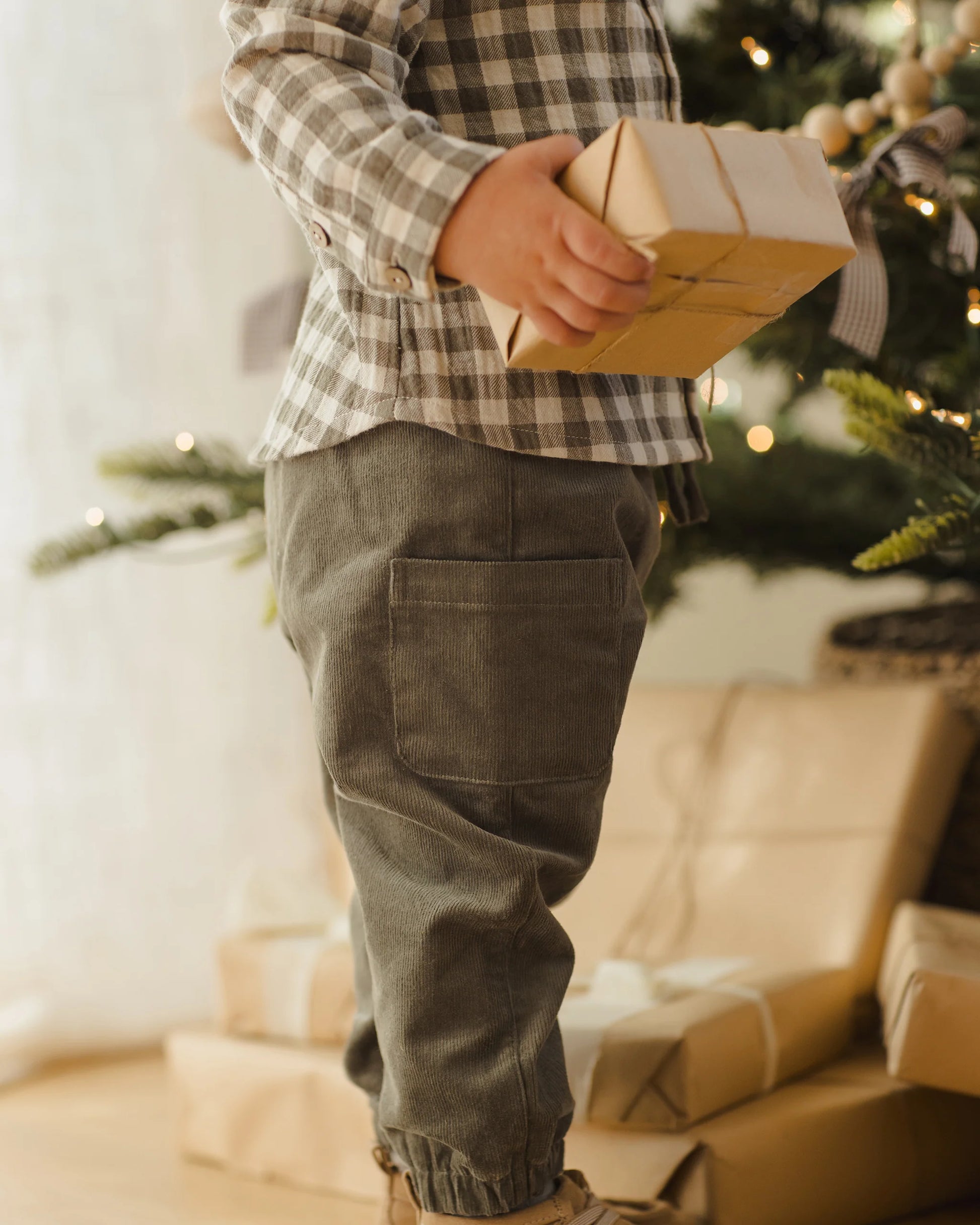 Comfortable corduroy pants with an elastic waistband and leg openings, adjustable drawstring, and side patch pockets.